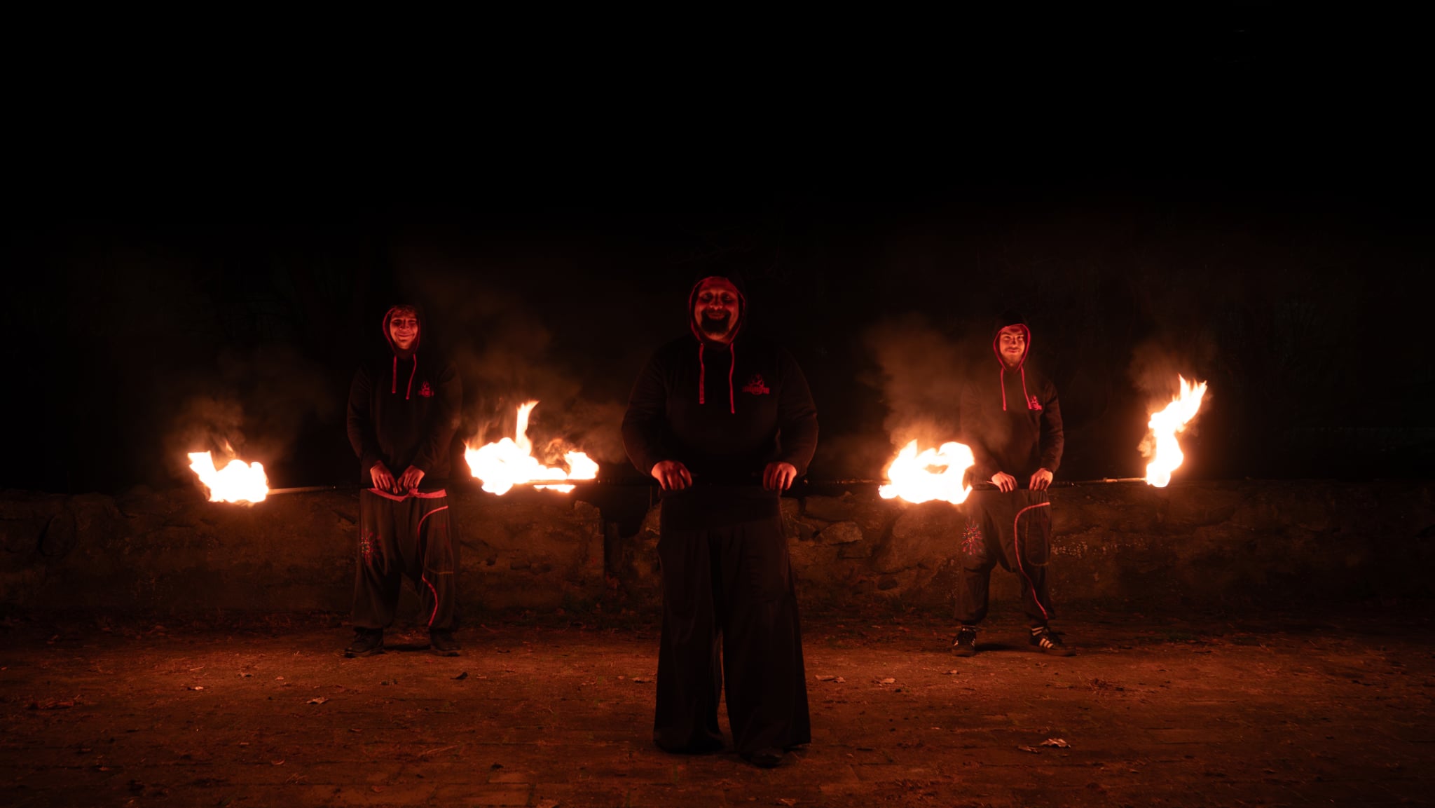 koreografált tűzzsonglőr műsor tűzjelmezben